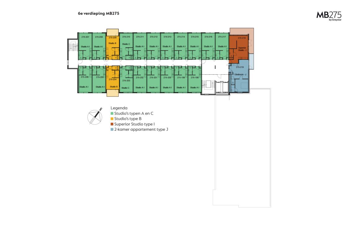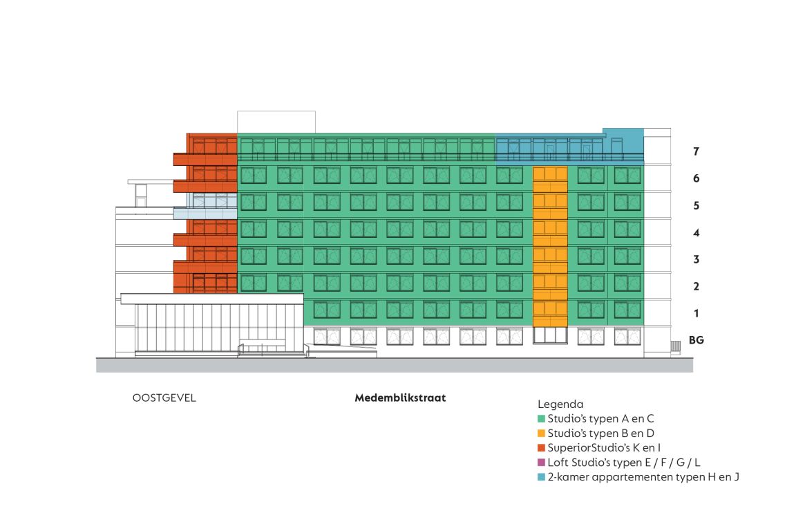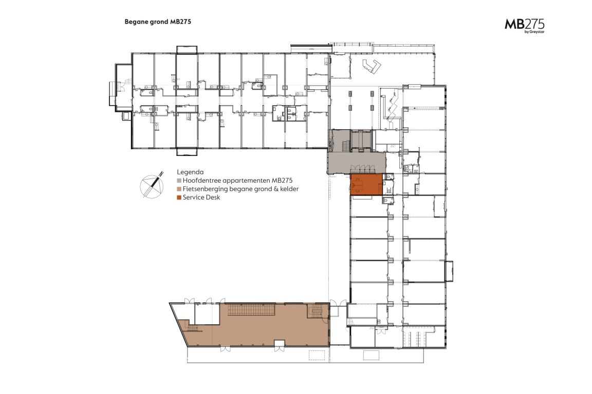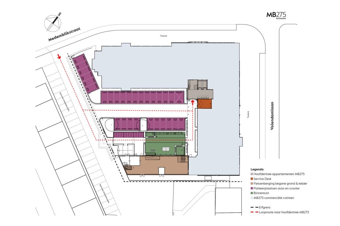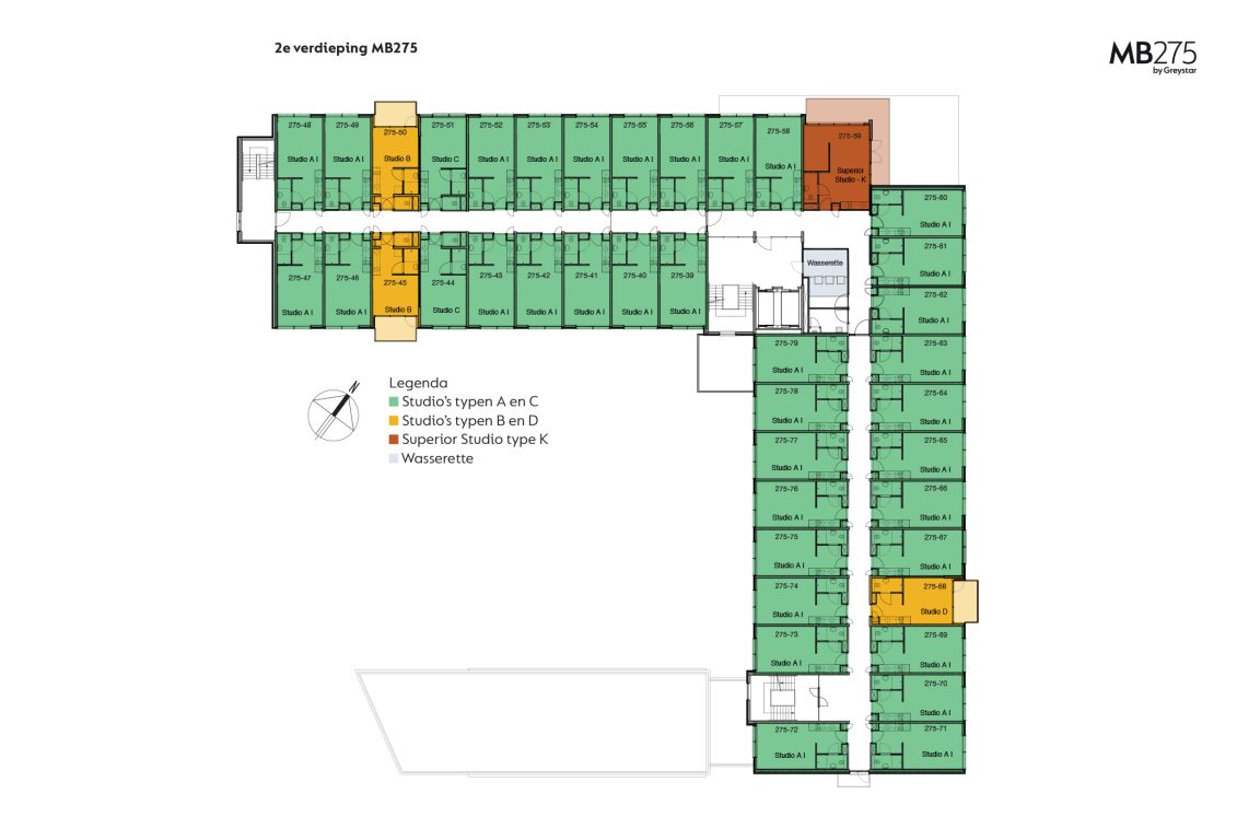 MB275 features 234 completely furnished apartments. The apartments can be reached through the main entrance which is located in the courtyard. Here you can also park your bicycle. The overview of the area provides you with information about the location of the building, how to get to the main entrance, the courtyard, covered bicycle shed and parking spaces. The different colors on the facade and floor overviews show the different apartment types.Which apartment will you choose?