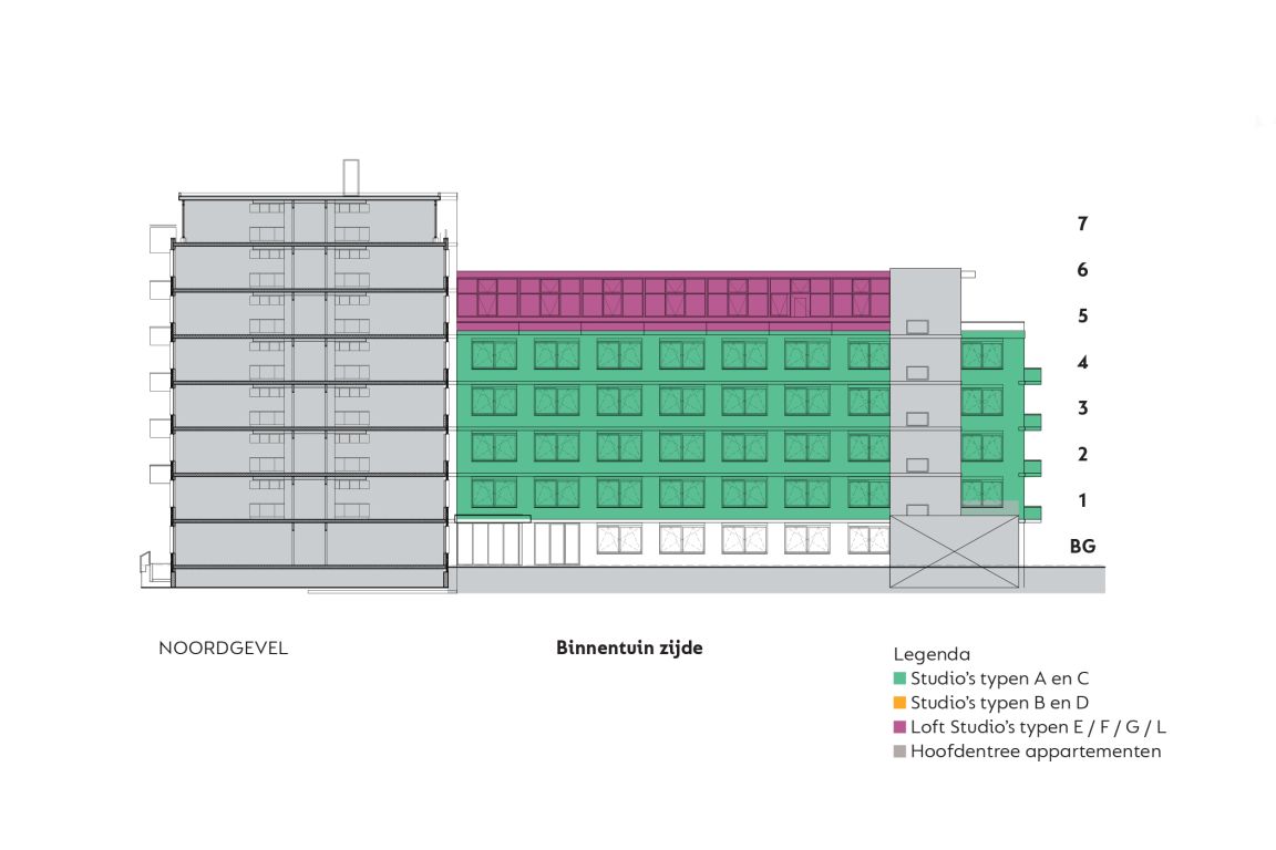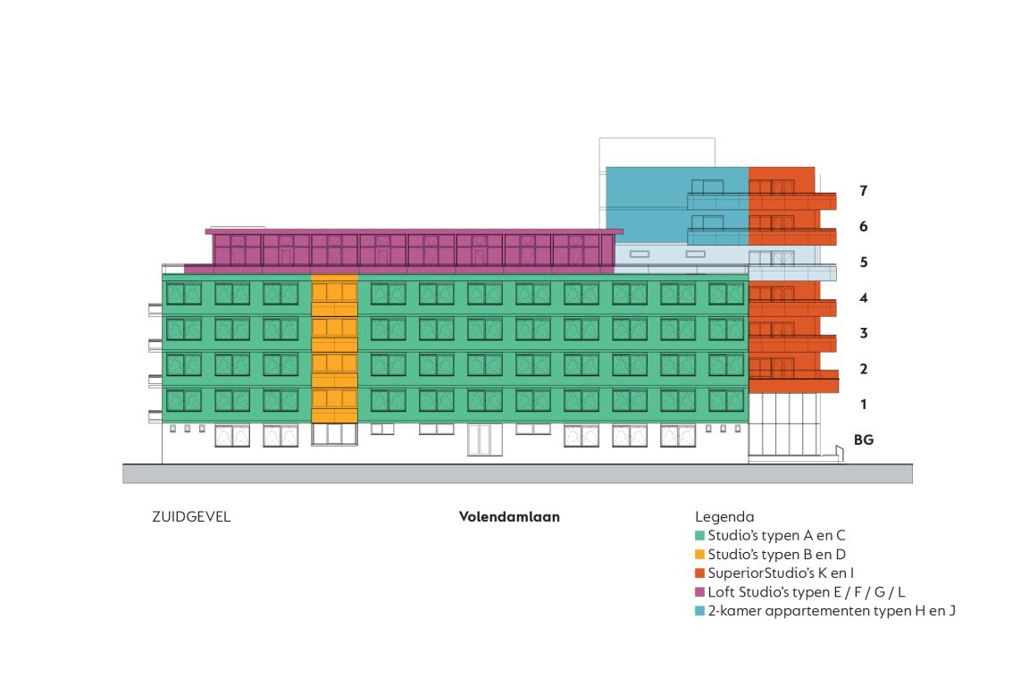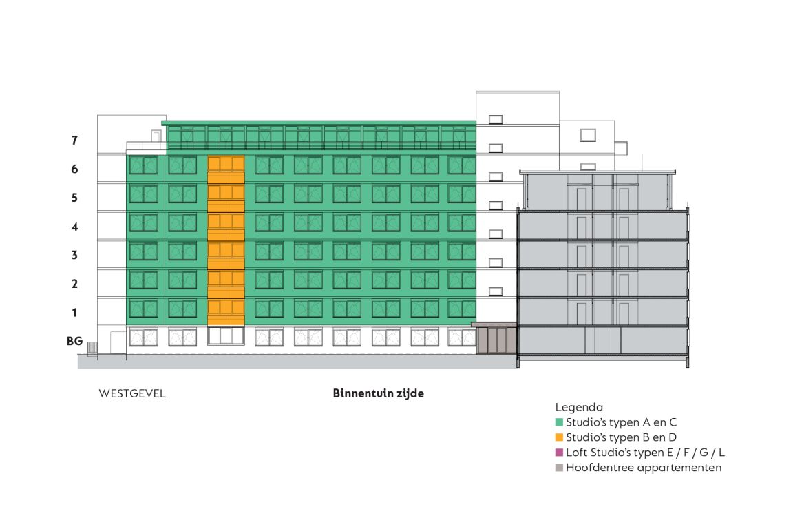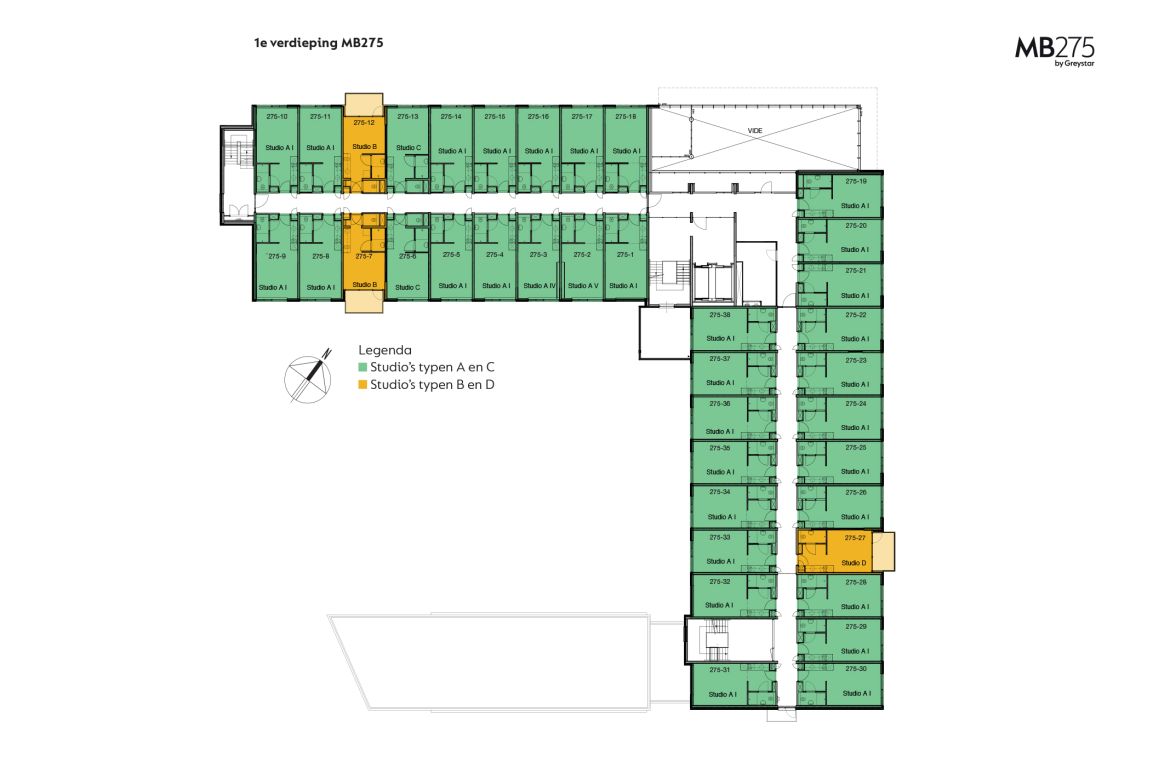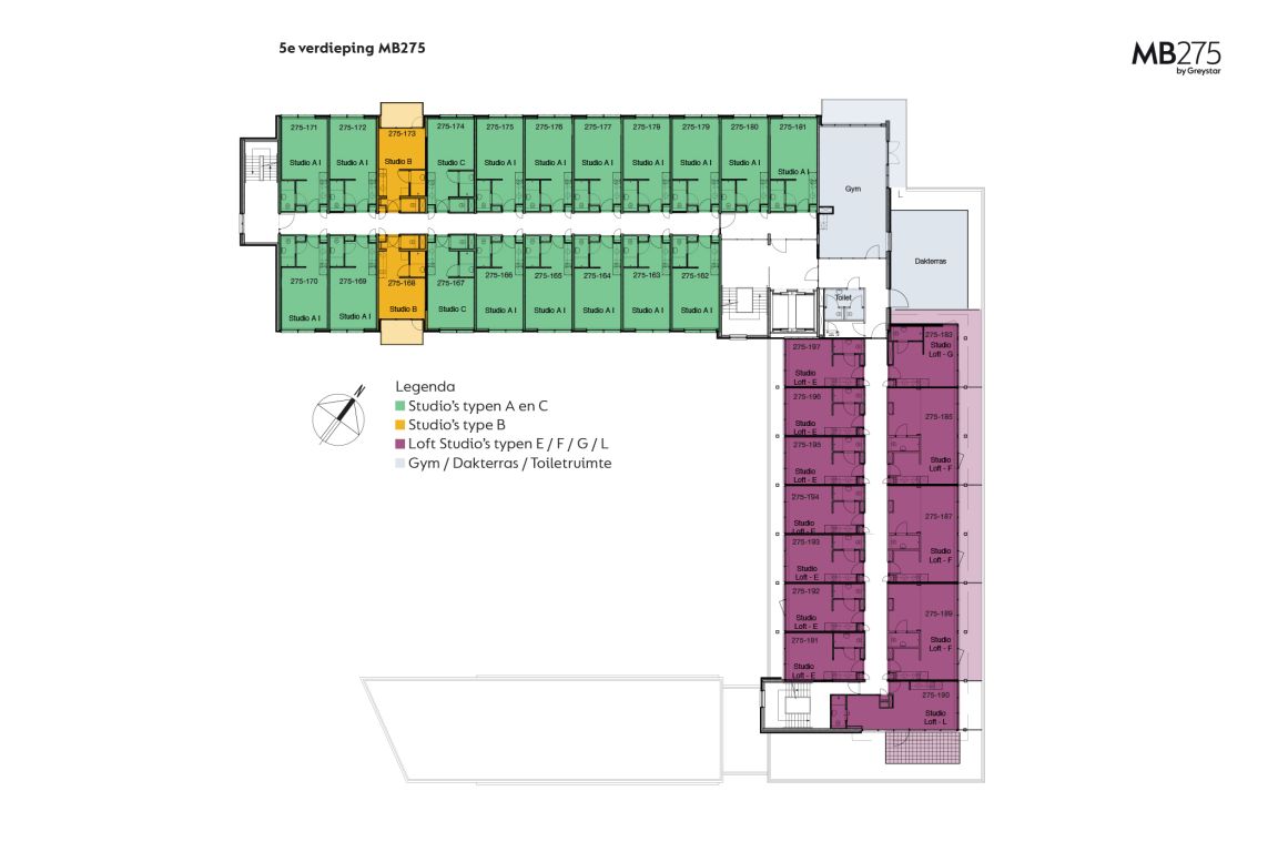 MB275 features 234 completely furnished apartments. The apartments can be reached through the main entrance which is located in the courtyard. Here you can also park your bicycle. The overview of the area provides you with information about the location of the building, how to get to the main entrance, the courtyard, covered bicycle shed and parking spaces. The different colors on the facade and floor overviews show the different apartment types.Which apartment will you choose?
